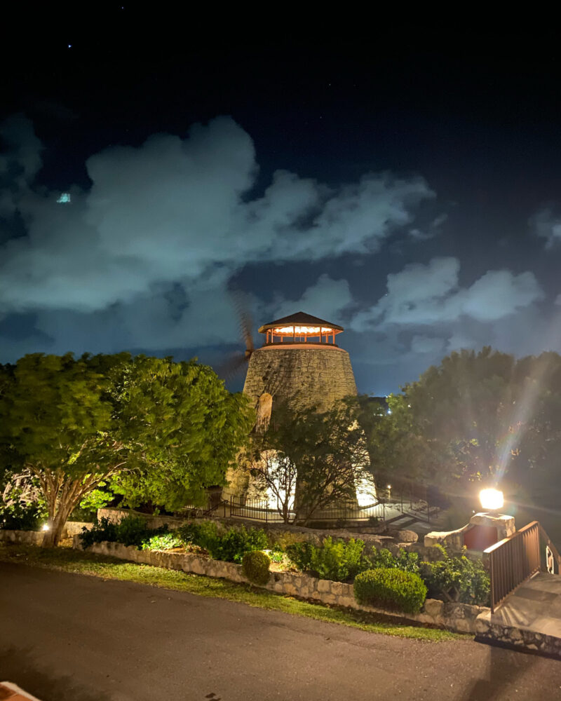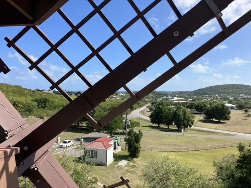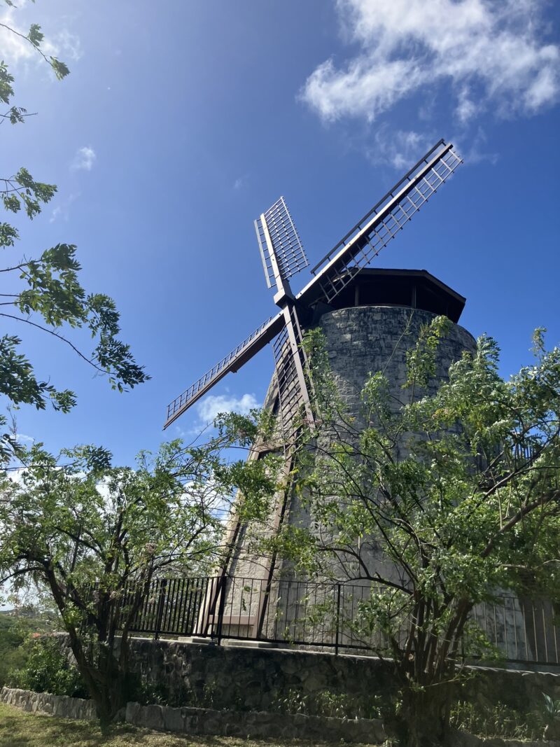 そして、最もアイコニックな構築物が、この風車です。実際に動いており、中を登ることもできます。この丘から見渡す景色は、単に深緑の風に揺れる木々というよりも、歴史を刻んだ自然、そして長らくこの島を見守ってきた自然であり畏敬の念を感じる程味わい深いものでした。イギリスがアンティグアを統治していた時代に盛んだった砂糖プランテーション。サトウキビの圧搾のために動力として使われていた風車。アンティグアにはこの風車のあとが数多く存在ありました。崩れ落ちたものもあれば、経年朽ちつつあるもの、レンガだけだったり、このホテルの様に風車としての機能を引き継ぎ保護されてているもの。今はただ綿あめのようなモクモクと浮く雲が風に流れていくのを見ているだけの姿に何故か郷愁を感じる。
