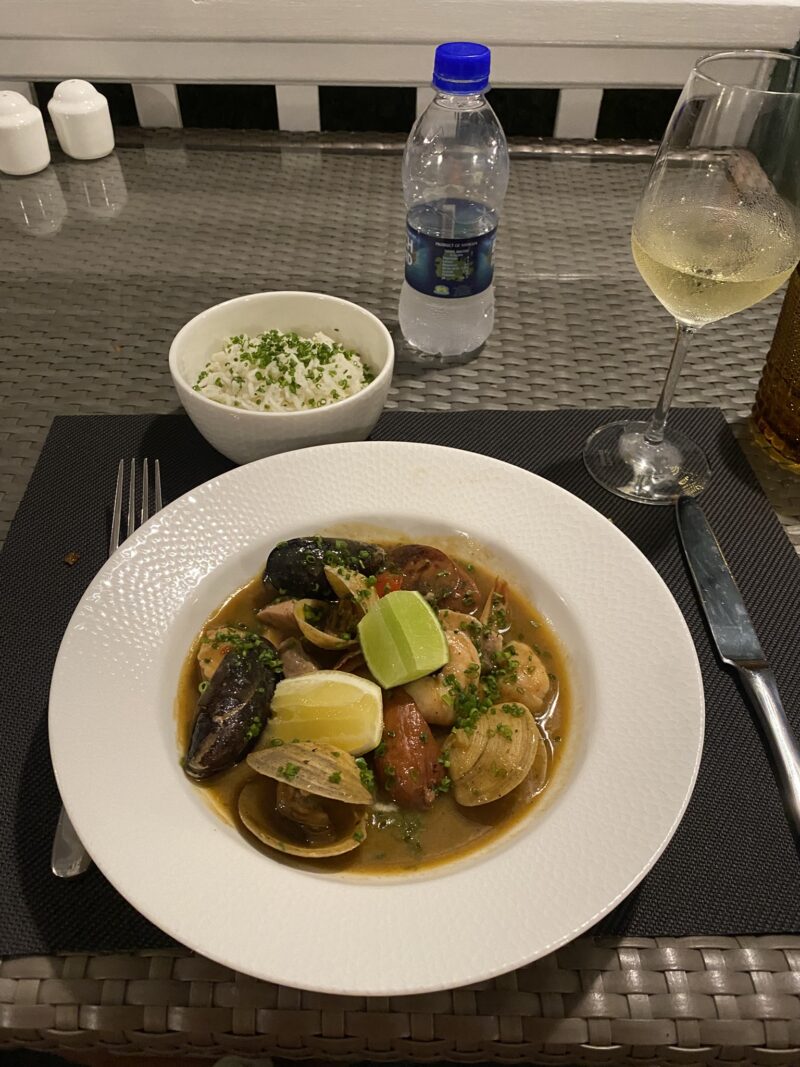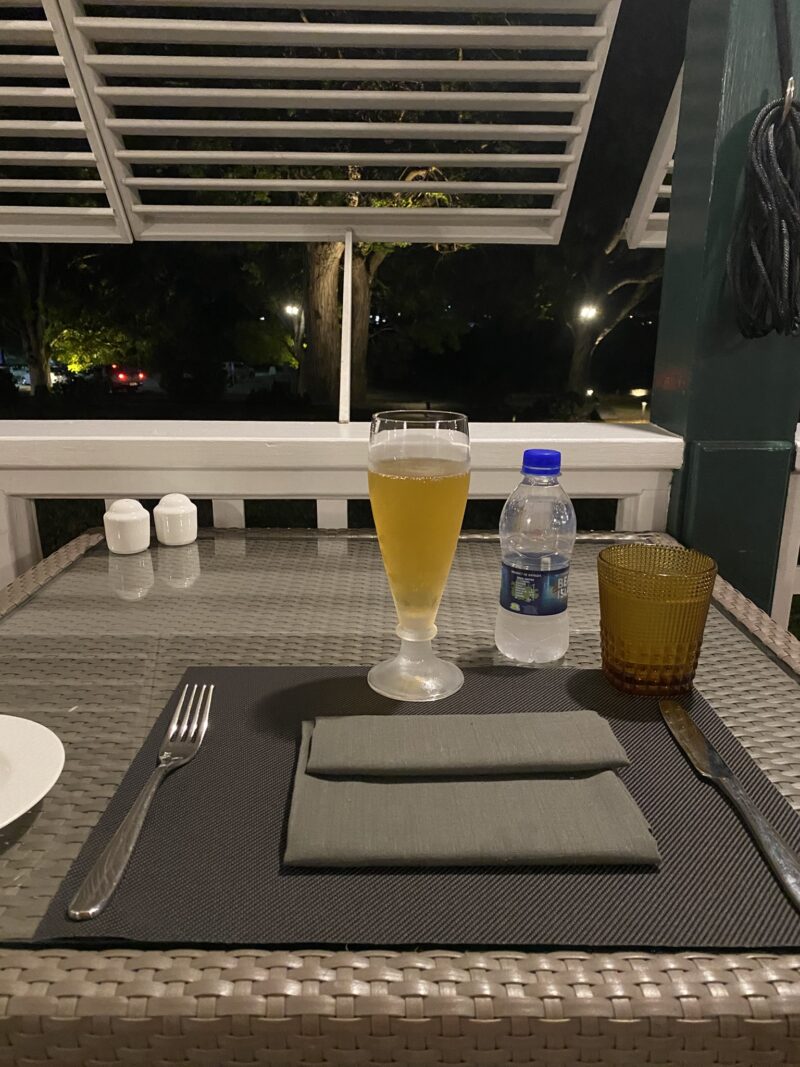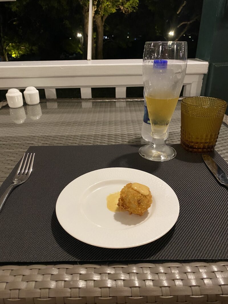 ここはたった7部屋しかない。1人旅は私の他にもう2人いたように思う。欧州から来ているような雰囲気の1人旅女性が話しかけてきた。彼女はずっと外で読書をしている。ビーチには行かないのだろうか。食事も非常にゆっくりで、テーブル脇に分厚い本をおいて食事をしてる。食後の紅茶を飲みながら、静かにそしてゆっくりとページをめくる。日中も同じ姿を見かけた。携帯を持ち歩いていないようにも見える。静かな丘の上で、木々が揺れ、こすれる自然の音の中で静かな時を楽しんでいるようだった。レストランには、宿泊者だけでなく地元の人も食べに来るようだった。子供を連れた8人組や着飾った4名が私の後ろで誕生日女子会をやっている。地元民の利用客が思いの外多く、レストランの評判の良さが伺えた。ビールにワインにブイヤベース、サラダ、ロブスター。おいしい。美味しい。シェフから新作コロッケの試作を食べてみてくれとサービスしてもらったコロッケ。このマスタードソースのようなマンゴーソースがこれまた良い。とにかく出てくるもの全てがしっかりとしたご飯でした。