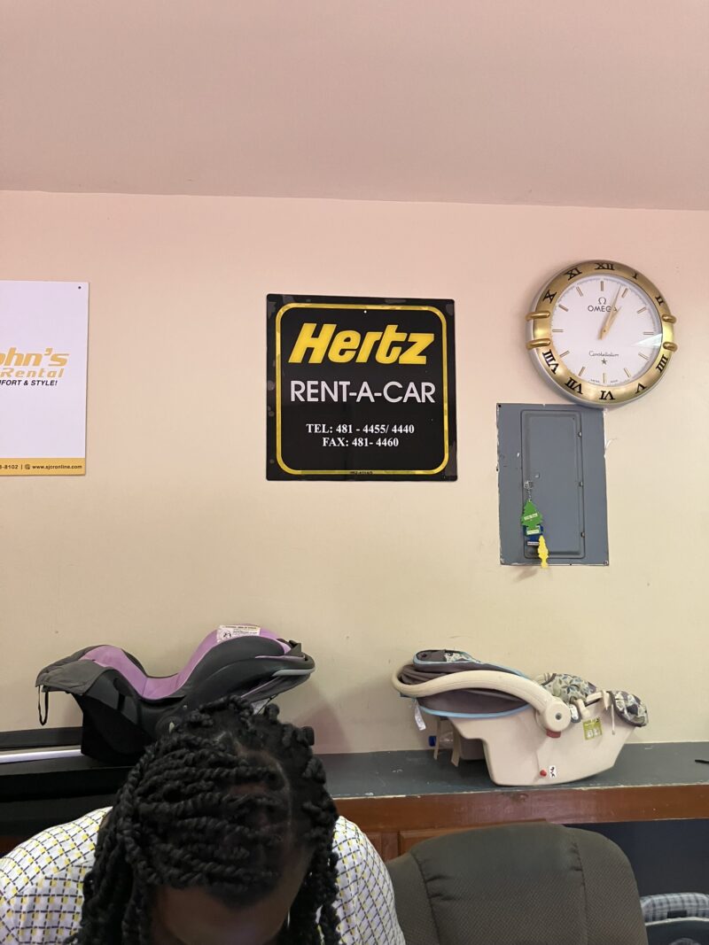 また、レンタカーの場合はCAR RENTALの黄色い上にかかっている看板に従って3分程歩きます。空港ターミナルを出て左の方に歩きましょう。タクシー乗り場のCAR RENTALと同様の看板に沿っていくと、平屋の小屋があります。そこは5社くらいのレンタカー会社のカウンターがある建物で、下の様に壁にレンタカー会社名の看板が貼ってあるだけです。時々人がいないので、隣のカウンターに話しかけると電話して呼んでくれます。みーんな顔見知り、特に競争もない感じでゆる~貸出業務をしてくれます。